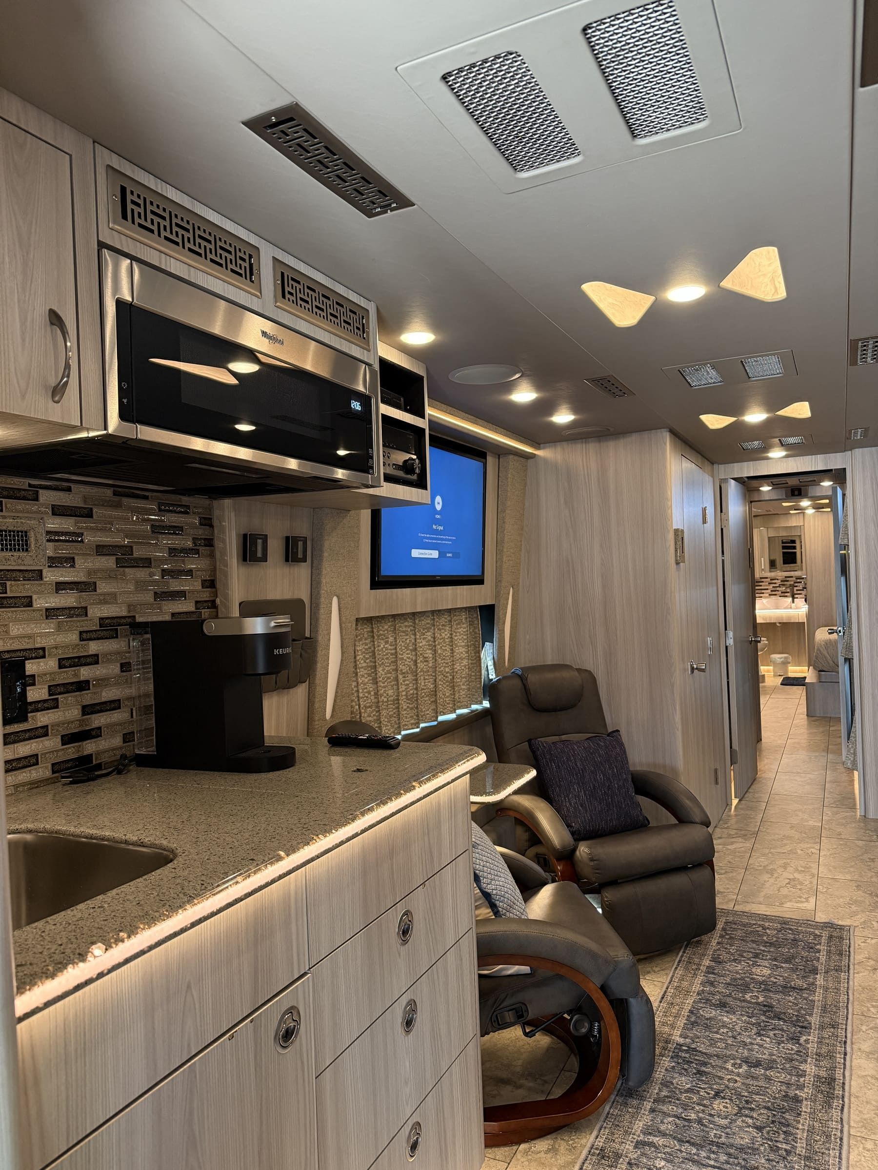 - Full kitchenette with microwave, fridge, and coffee station with two flat top burners