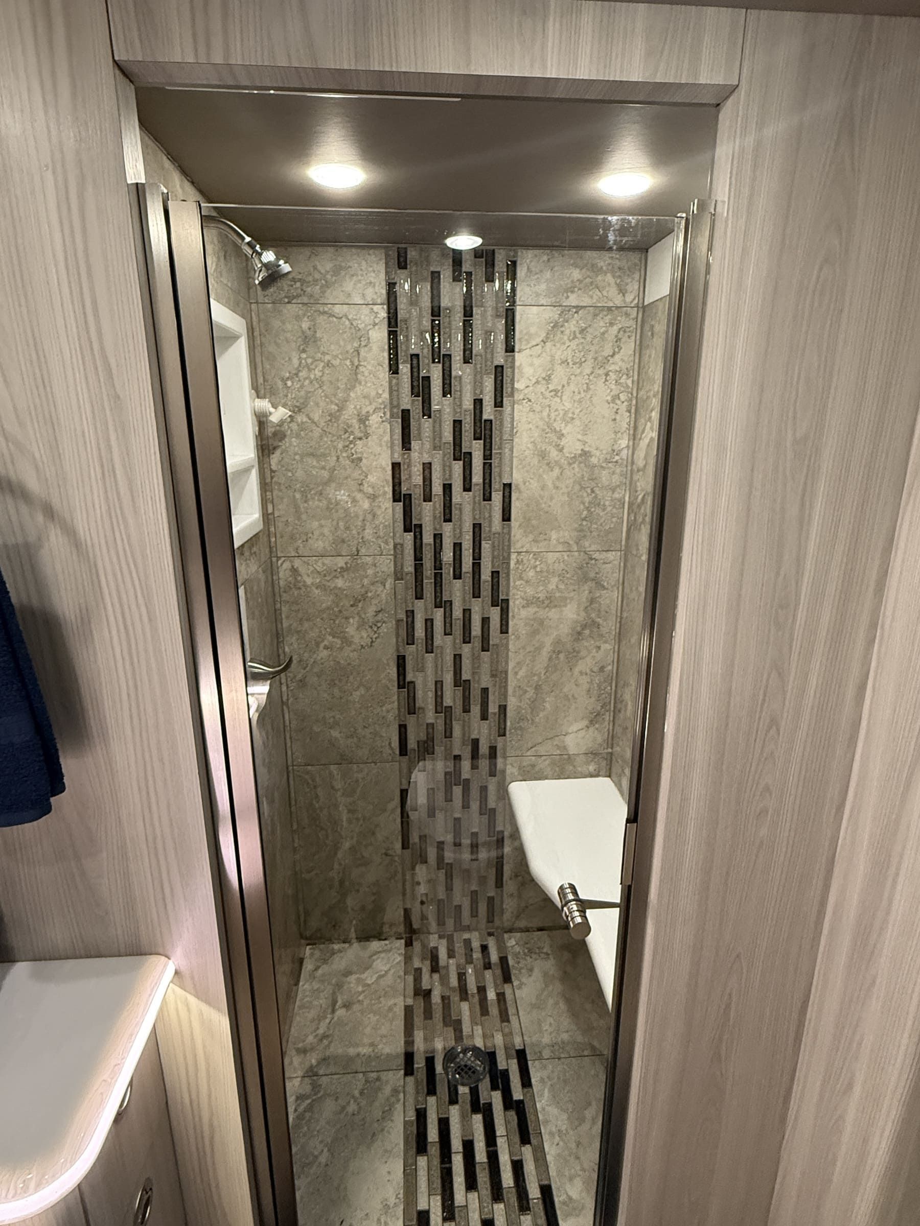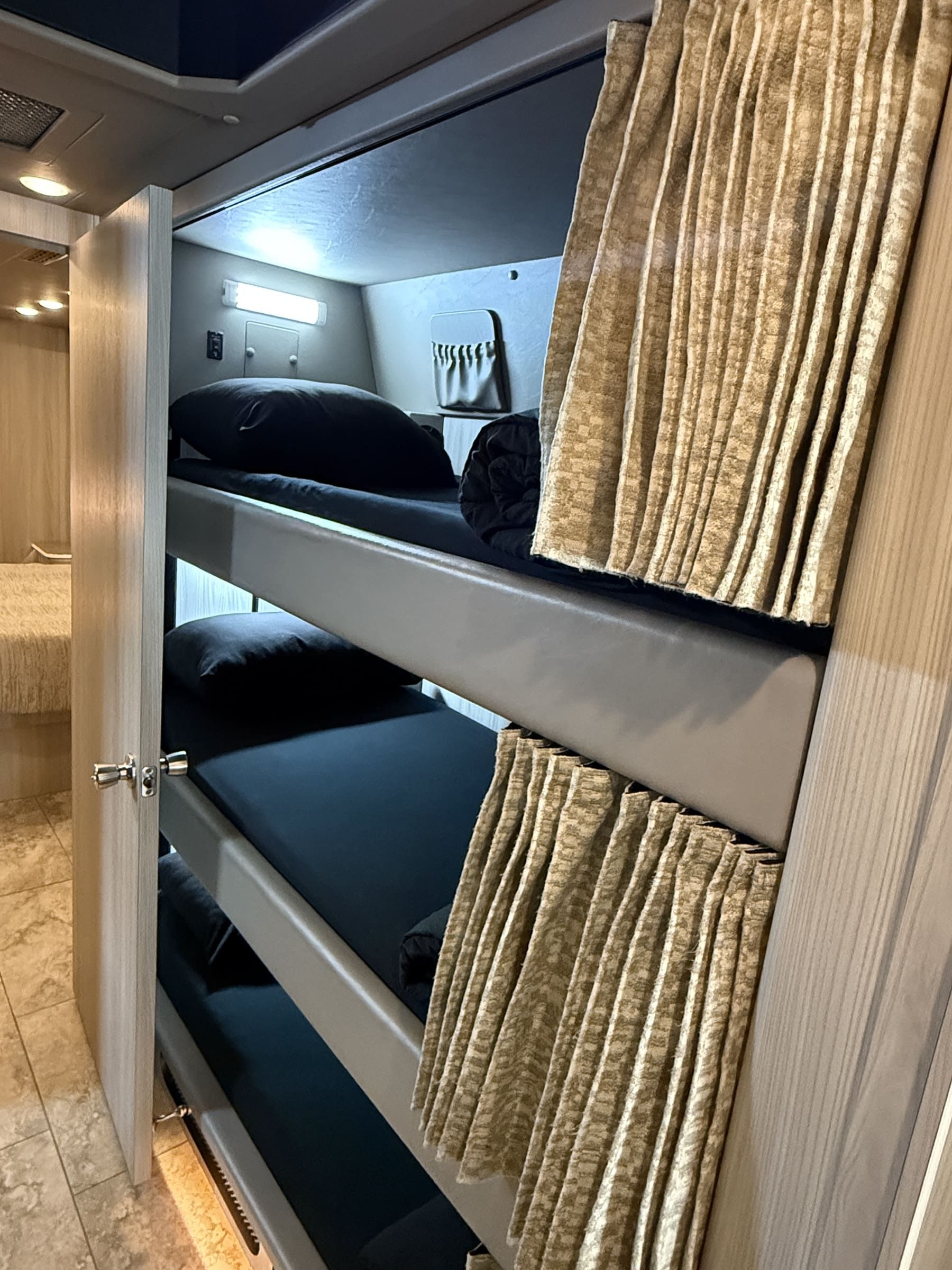 - Sleeps 6–8 passengers with a private suite and a rear full bath