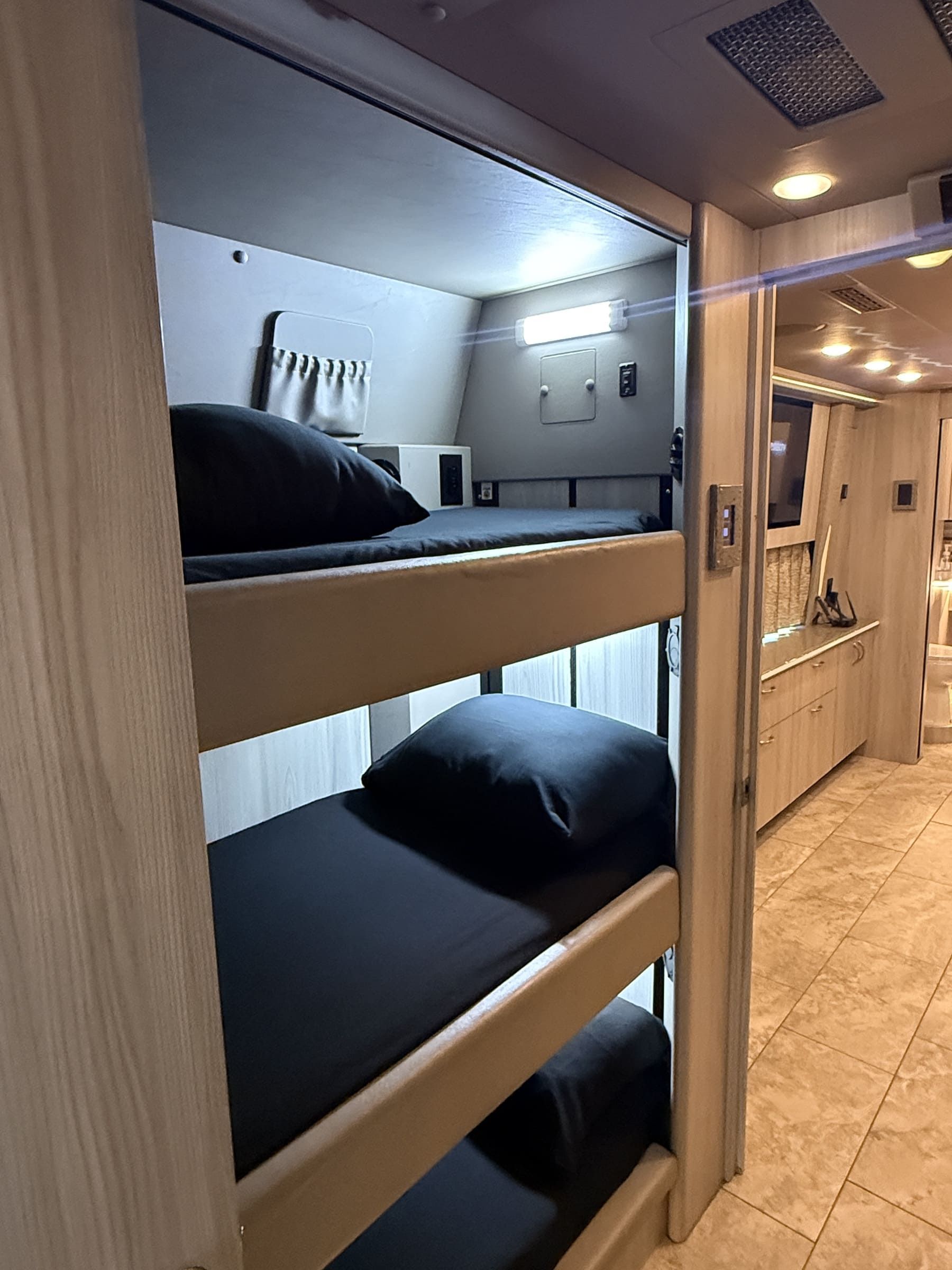 - Flat-screen TV, Bluetooth stereo, DVD player, and USB ports